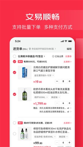 4. 创新采购车批量下单模式,支持多SKU合并结算与周期性采购计划设置;